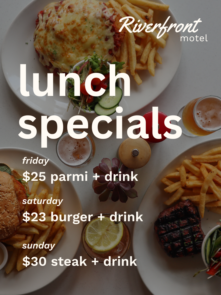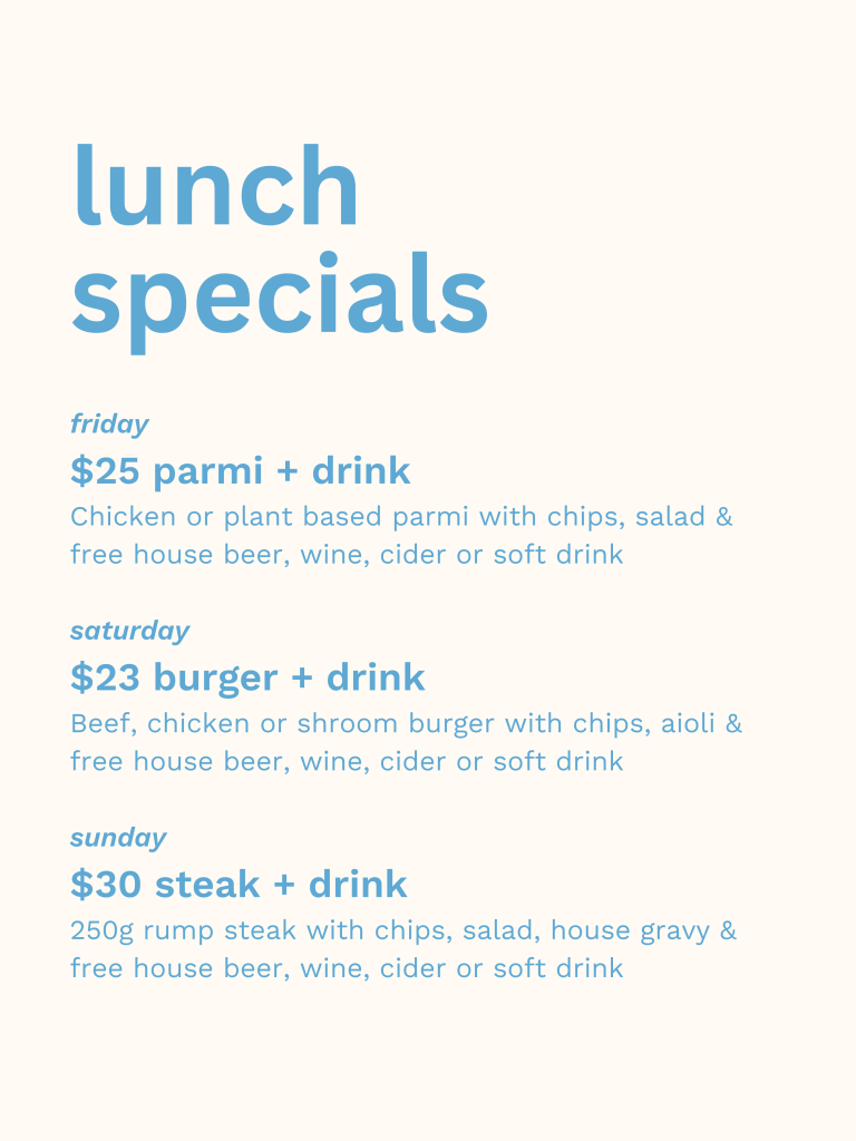 Our weekly lunch specials are available every Friday- Sunday. Our locally renowned parmis, burgers & steaks with a free drink at a discounted price! See the below details.